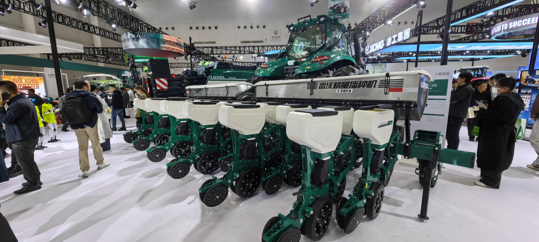展会现场,潍柴雷沃智慧农业还展示了18行电驱精量播种机、电驱复式精量条播机等系列高端农机具。其中,雷沃18行电驱精量播种机能够实现一机多用,可精量播种玉米、大豆、高粱等农作物,作业速度达12km/h,速度快、效率高;电驱复式精量条播机采用碎土整平二次镇压技术,实现小麦复式播种作业关键核心技术突破,还具有漏播、堵播、作业面积统计等智能监控系统功能,能够进一步提升作业质量,增产效果更为显著。